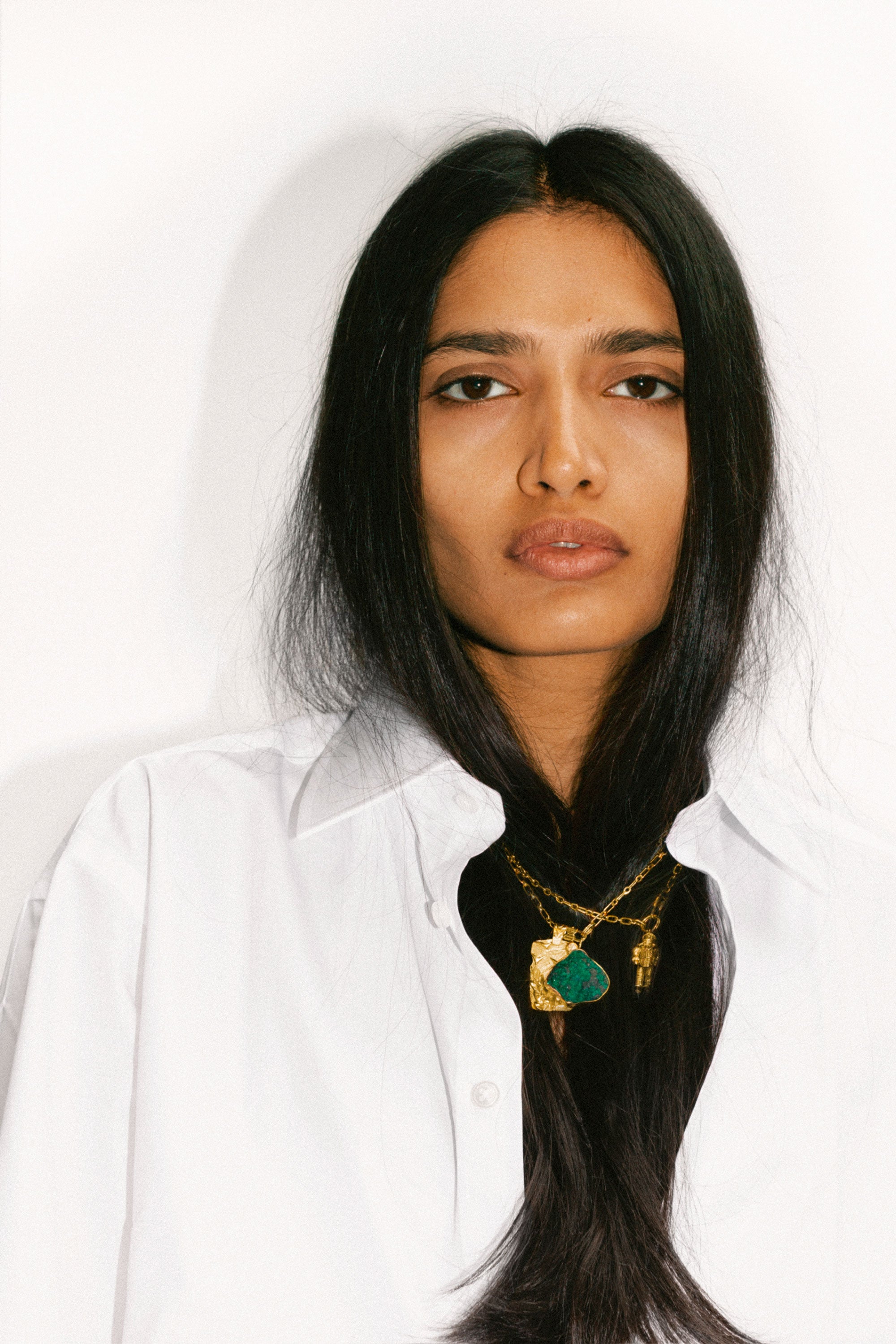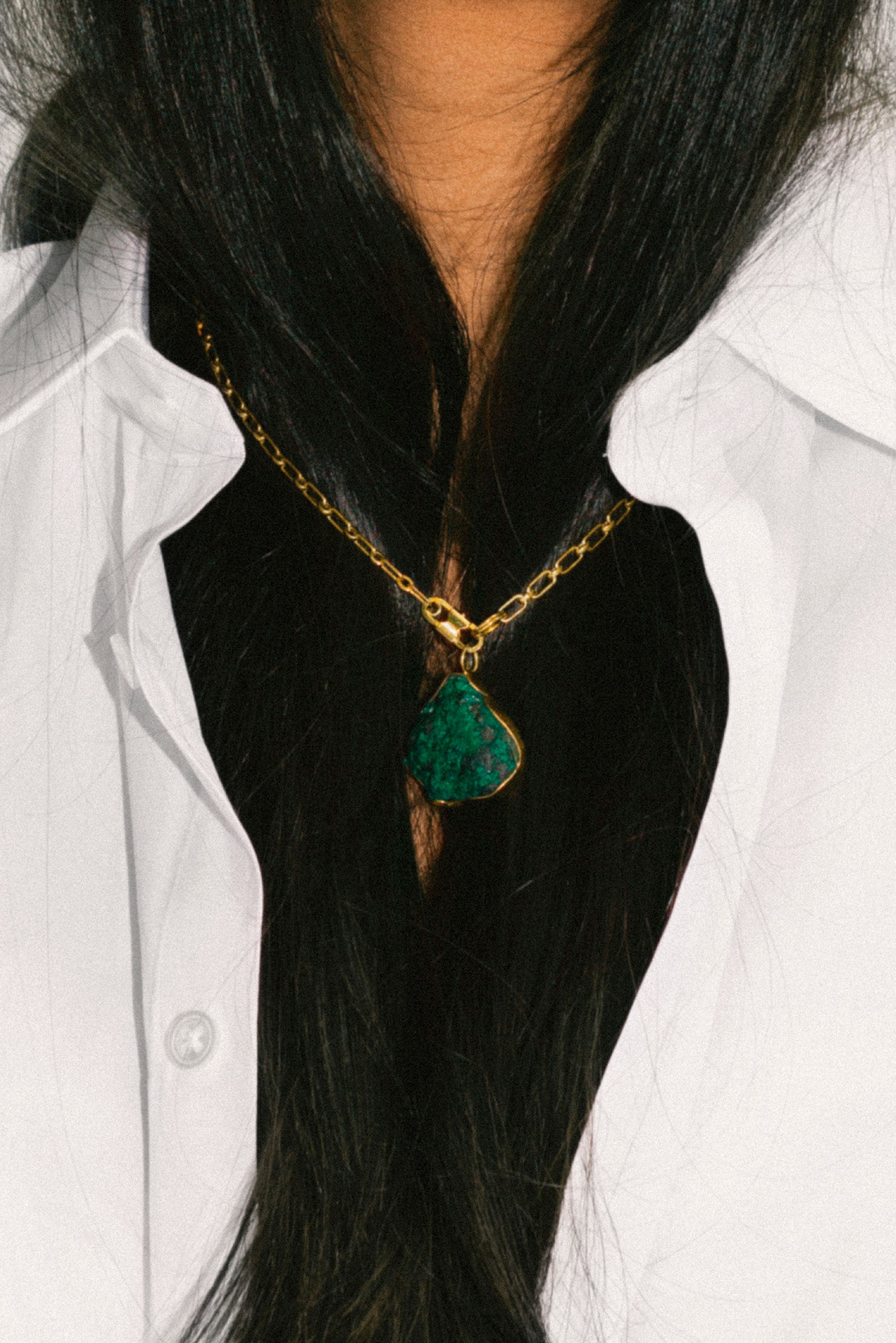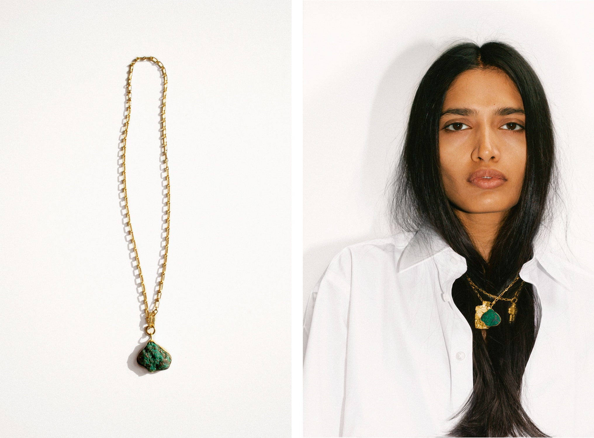 The original 77–link chain, with its uniquely designed clasp–closure, together with 18 karat gold pendants and rings, elevate the familiar, finished with responsibly sourced diamonds, raw emeralds and lapis lazuli.